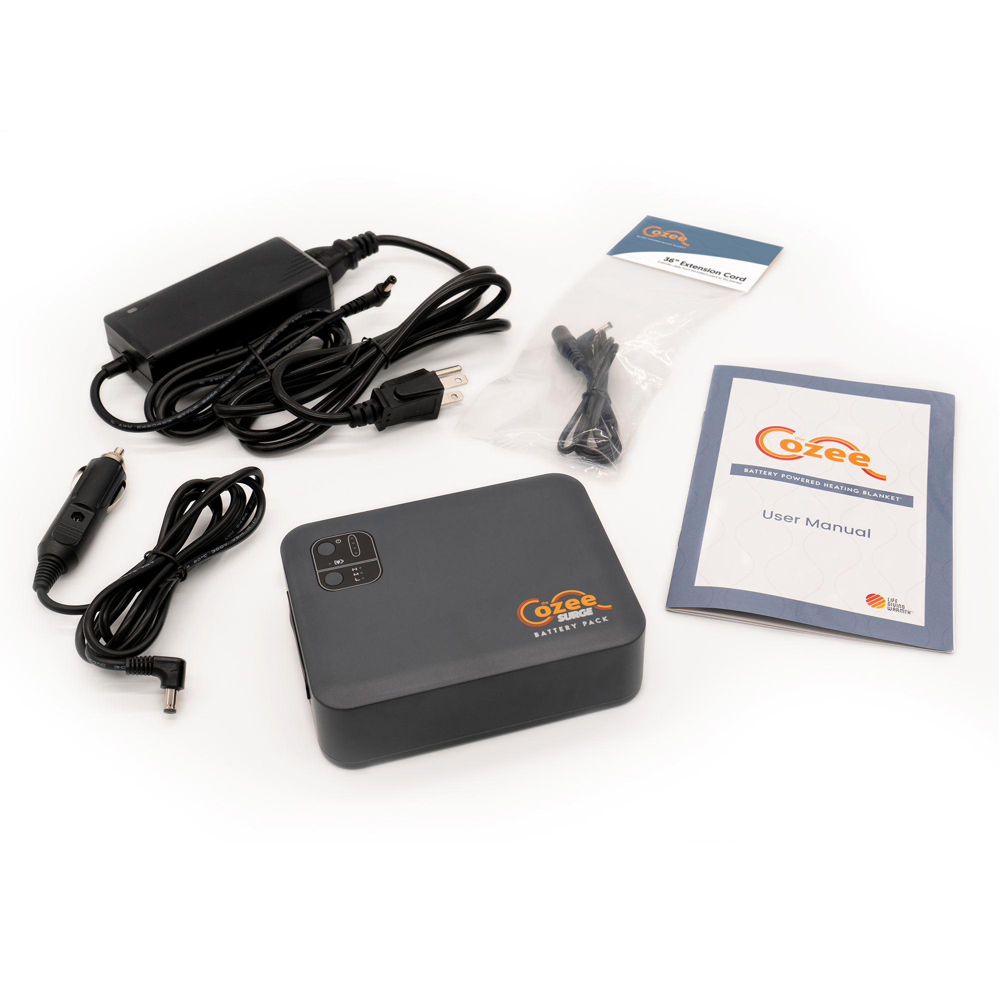 The Cozee Heated Blanket comes complete with the battery pack, 36” extension cable (for convenient battery placement), car charger, wall charger and a handy carrying case with internal pockets and a zippered outside pocket for blanket accessories, water bottles, snacks, or whatever else you’d like available for your outdoor adventure.